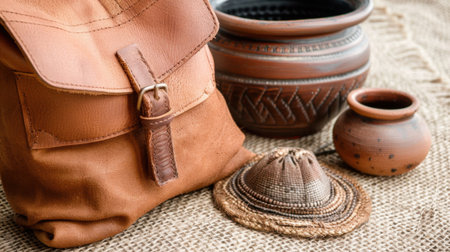 Captivating arrangement featuring a rustic leather backpack alongside traditional pottery pieces, highlighting organic textures and earthy tones.
