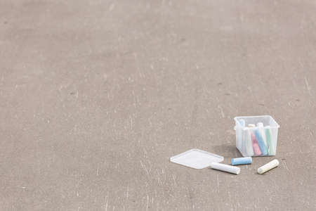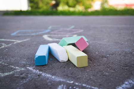 Colorful chalk on the asphalt. Drawing with chalk on the pavement. multicolored crayons for drawing.