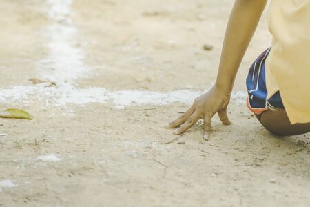 Cute little child draws the sun with chalk outdoors, summer time, chalk. Selective focus. Nature