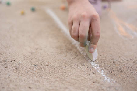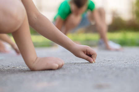 Children draw with chalk on the road. Children's creativity on the street. entertainment in nature.