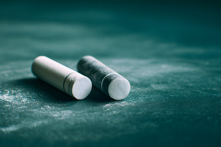 Two old chalk erasers, with colored chalk residue on their surfaces, rest on a blackboard covered in chalk dust. The light creates a nostalgic atmosphere.