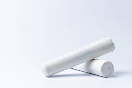 Yellow and red thick stick of chalk on blue background, small pieces of yellow and red chalk scattered on the background