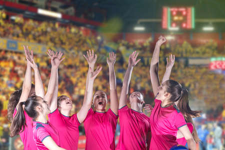 Rear photo of three horny girls actively supporting their team with raised arms in the gym. Concept sports competition .