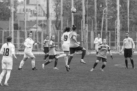 ODESSA, UKRAINE -31 DECEMBER 2021: Women's football on grass field of stadium. Football Championship among women White - FC Chernomorets Odessa - Yunost Chernigov. Game moment of girls football