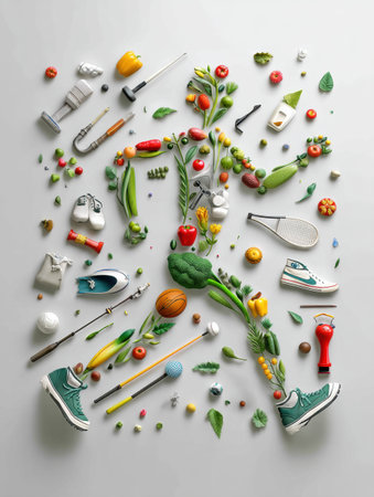 A dynamic figure composed of various vegetables and sports equipment captures the essence of movement and healthfulness in a vibrant layout.