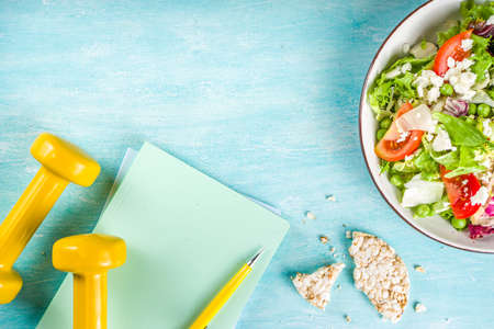 Healthy eating, slimming. dieting and weigh loss concept background. Fresh greenery summer salad with fruit, measuring tape, dumbbells and diet plan dairy notepad, flat lay above copy space
