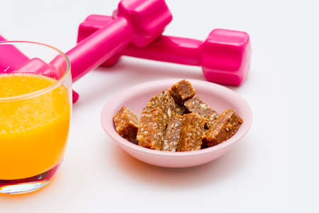 Gym concept with healthy life. Close up view of cup and raw bars with orange juice and pink fitness equipments.