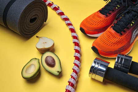 measuring tape armband dumbbells shoes water bottle avocado cherry tomatoes yellow background. High quality photo
