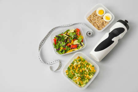 Containers with healthy food, bottle for water and measuring tape on gray background