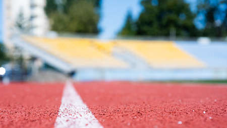 running track in selective focus. finish line. health and sport. path for runners. racetrack on outdoor stadium. stadium arena soccer field. healthy sports life. treadmill in gym