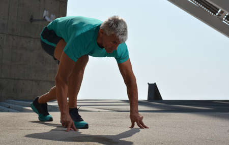 Athlete man in running start pose on the city street.