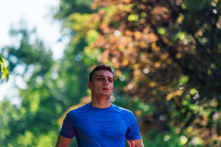 Close up portrait of handsome young man with green eyes and blue t-shirt running in the park