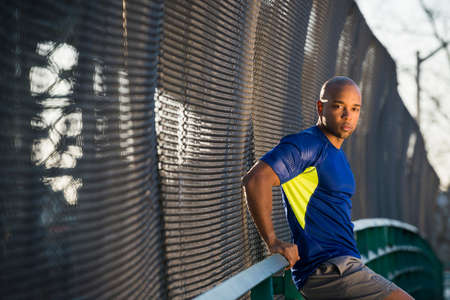 Young african man jogger exercising outdoors on a bridge, getting ready to start running
