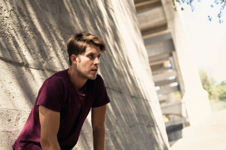 Young Man In Sweaty Shirt Resting After Intense Workout Break Against Concrete Wall. Handsome Caucasian Sportsman With Strong Muscular Body In Fashion Sportswear Looks Confident.