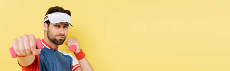 Sportsman in visor training with dumbbells isolated on yellow with copy space, banner