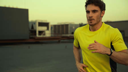 Young brunette sportsman running on roof of building in evening