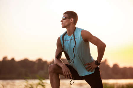 Champion. A young athletic man working out, training listening to music at riverside outdoors. Concept of healthy lifestyle, wellness, sport, activity, weight loss. Inspired of nature, summertime.