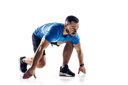 Start up. Caucasian professional male athlete, runner training isolated on white studio background. Muscular, sportive man. Concept of action, motion, youth, healthy lifestyle. Copyspace for ad.