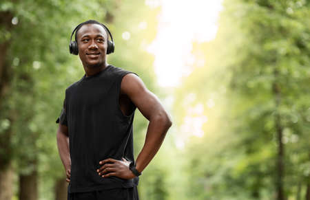 Handsome black sportsman with earphones posing at city park while getting erady to marathon, empty space