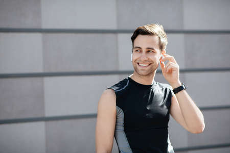 Great mood and sport. Smiling guy in sportswear with fitness tracker puts on headphones on gray wall background, free space
