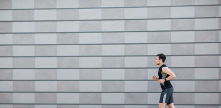 Slender guy in sportswear with fitness tracker runs on gray brick wall background, side view, panorama, free space