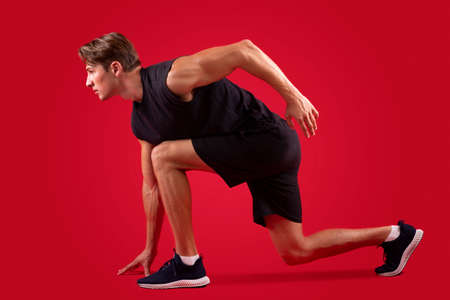 Side view of fit young sportsman standing on start over red studio background. Strong millennial sprinter in sportswear ready to run race or marathon. Healthy lifestyle concept