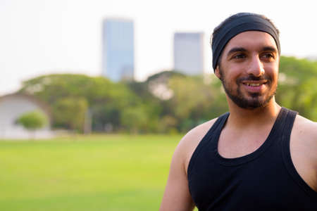 Face of happy young handsome bearded Indian man thinking at the park