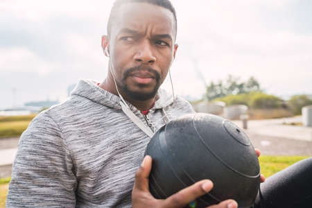 Portrait of an athletic man doing abdominal exercise with medicine ball in the park outdoors. Sport and healthy lifestyle.