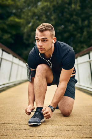 Laces tied and ready to blast off. Shot of a sporty young man tying his shoes before going for a jog outside during the day.