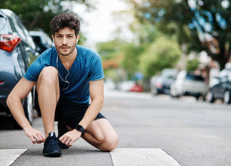 Get ready to run your heart out. Shot of a sporty young man tying his shoelaces while exercising outdoors.
