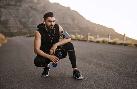 Athlete focused on running training for marathon, preparing for morning run, motivational music in headphones, athletic man turns on watch app monitoring heart rate, route.