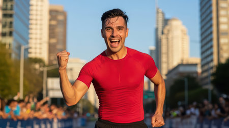 Young caucasian male celebrating marathon victory in urban setting.