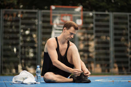 Sporty muscular man tying laces on sport sneakers before morning run at outdoor basketball court. Young fitness man training on fresh air.
