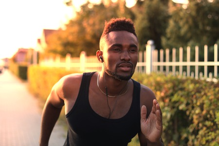 African man in sports clothing running while exercising outdoors, at sunset or sunrise. Runner.