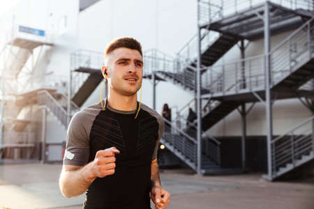 Image of pleased caucasian sportsman in earphones running while working out at urban area outdoors