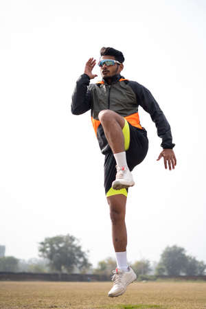 Young Indian boy exercising and jumping on the sports field. Sports and healthy lifestyle concept.