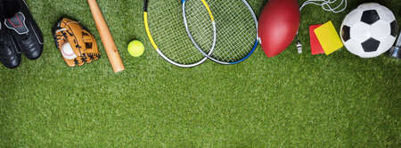 High Angle View Of Different Sports Balls And Equipment Fake Green Turf Grass Backdrop