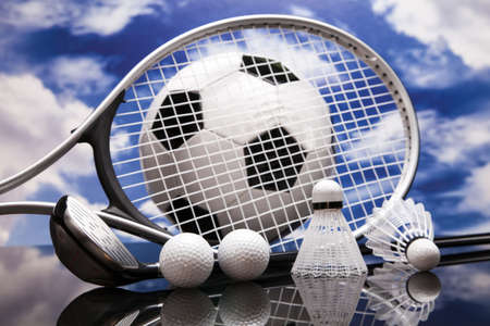 Sporting gear includes a tennis racket, football, dumbbell, and tennis ball, all set on a clean surface with room for text.