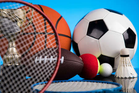 Sports equipment soccer, basketball, Blue Sports Equipment Collage 3d illustration