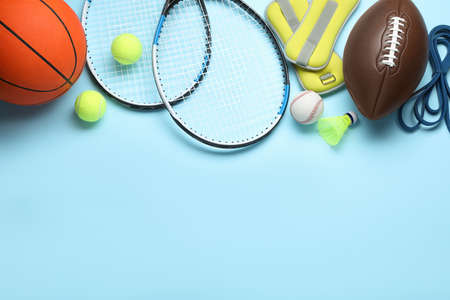 Set of different sports equipment on light blue background, flat lay. Space for text