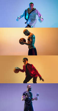 Collage. Close-up portraits of young sportive man, different sport athletes posing over multicolored background in neon light. Concept of healthy lifestyle, sport, hobby, power and strength