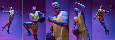 Composite image with dynamic portraits of young professional basketball player in motion, training isolated over purple background. Sport concept