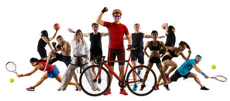 Sport collage. Cycling, running, fitness, bodybuilding, tennis, fighter and basketball players. Mixed image. On white background