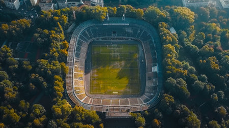 Stunning aerial view of a modern stadium featuring a vibrant green soccer field and empty stands during sunset in an urban setting. Ideal for sports themes.