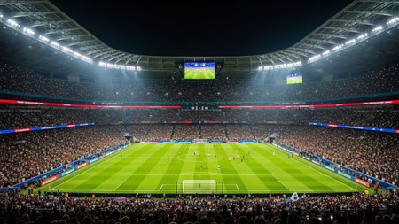 Excitement builds in a stadium as lights shine during a crucial match at night
