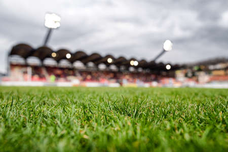Grass at football stadium during soccer match. Stadium tribune at background