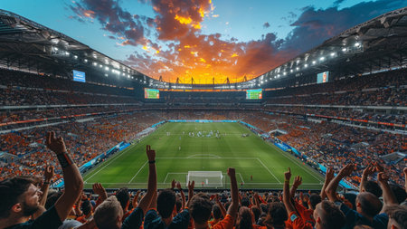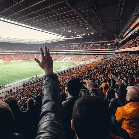 Amidst the electrifying atmosphere of the stadium, a sea of enthusiastic sports fans rises to their feet, their cheers echoing throughout the arena as they rally behind their beloved team, encouraging them towards victory with unwavering support.