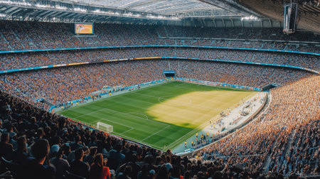 Large stadium filled with lots of people watching soccer game on sunny day. Generative AI.