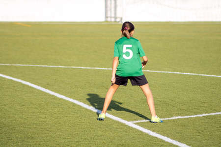 Back view of young football player putting forefingers in his ears while standing on green lawn at large contemporary stadium