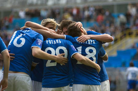 DNEPROPETROVSK, UKRAINE – APRIL 24: Footballers FC Dnepr celebrate goal during their Uk. Championship game against FC Tavriya on April 24 , 2010 in Dnepropetrovsk.
